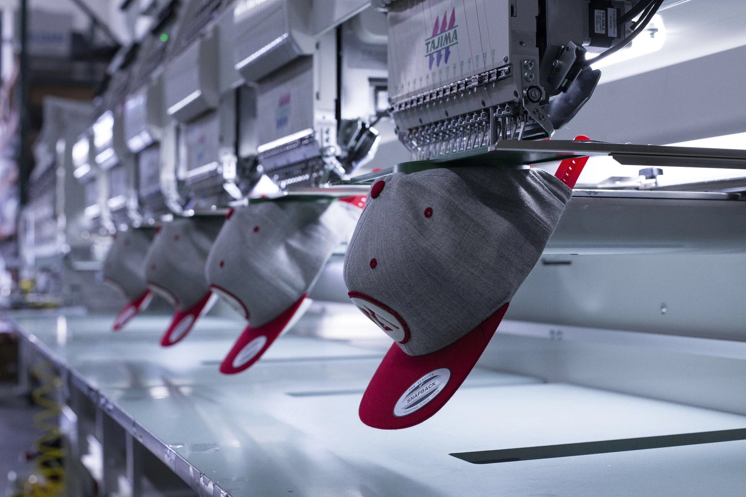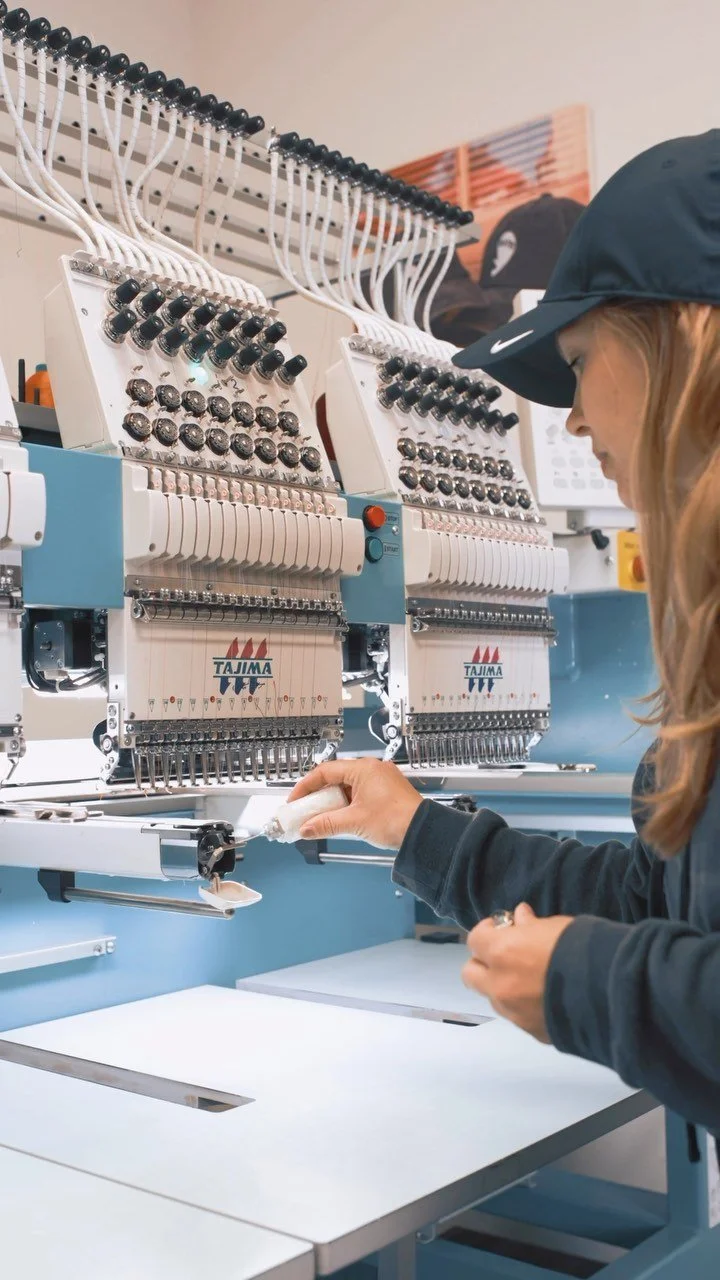 Our Fullerton shop operates commercial embroidery equipment that allows us to produce consistent, professional-quality embroidery across repeat orders for uniforms, hats, and team apparel.